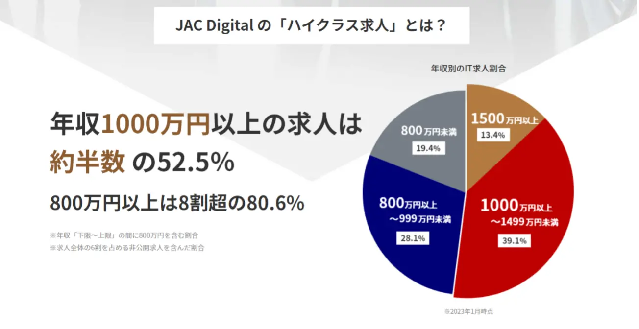 また、求人全体の80.6%が年収800万円以上なので年収UPを希望している方にピッタリなエージェントだと言えます。