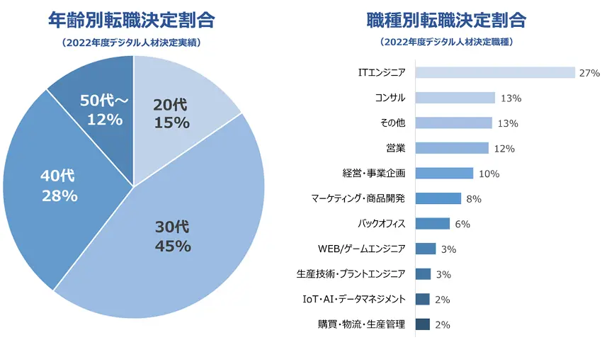 JACデジタルが実施した職種別転職決定割合によると、ITエンジニア「27%」、コンサルタント「13%」、営業関係「12%」、経営・事業計画「10%」であることが分かりました。
