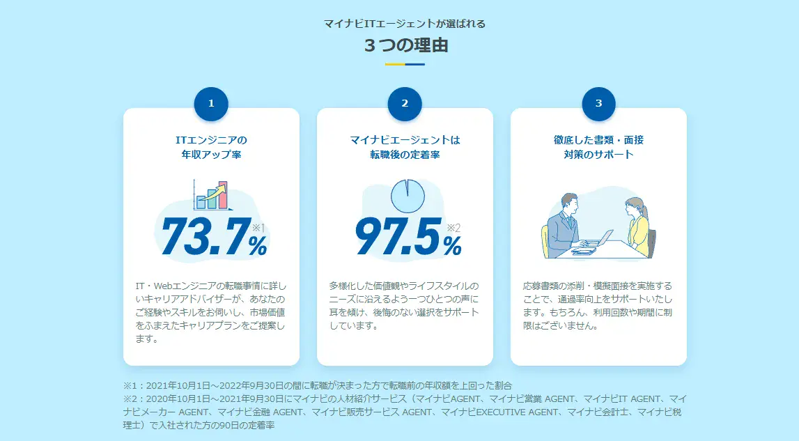 というのも、マイナビIT AGENTを利用して転職活動を成功させた方の73.7%が年収アップに成功していたり、入社後90日間の定着率が97.5%と高い水準であったりなどの強みがあるからです。そのため、これらの特徴に当てはまった方は、マイナビIT AGENTを活用しましょう。